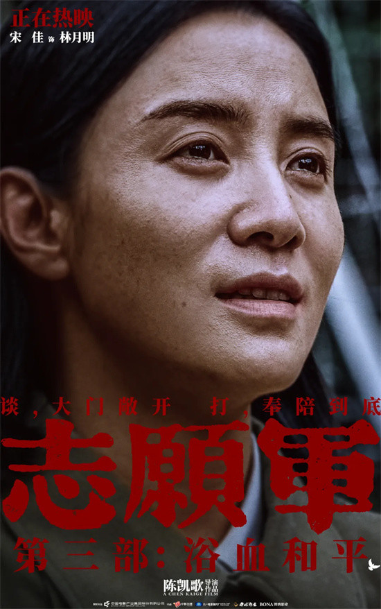 到了《志愿军:存亡之战》,李晓来到炮火前线,与父兄身处“同一战场”。她在铁原阵地向敌军喊话“Go home!”,高呼“子弹杀不死歌声”。虽然经历了战火的洗礼和失去至亲的痛楚,但这并没有压垮她,反而让她更深刻地理解了父兄守护的是什么。